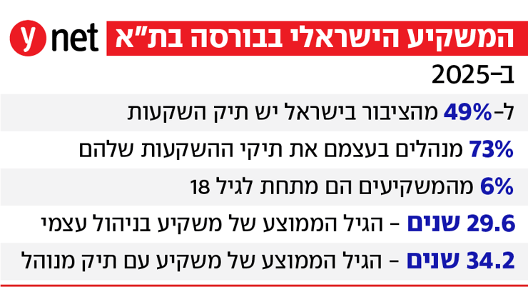 הציבור הישראלי הרחיב את פעילותו בבורסה לניירות ערך בשנת 2025: שיעור בעלי תיק השקעות פעיל מקרב הציבור עלה ל-49% לעומת 40% בשנה הקודמת. תוצאות הנהירה לבורסה: למעלה ממחצית המשקיעים הפעילים מדווחים שתיק ההשקעות שלהם הגיע עד ל-50% מסך כל ההשקעות שלהם, כולל נדל"ן, קופות גמל וכדומה. כך עולה ממחקר שערכה הבורסה לניירות ערך בנושא אפיון המשקיע הישראלי בבורסה בשנת 2025.
