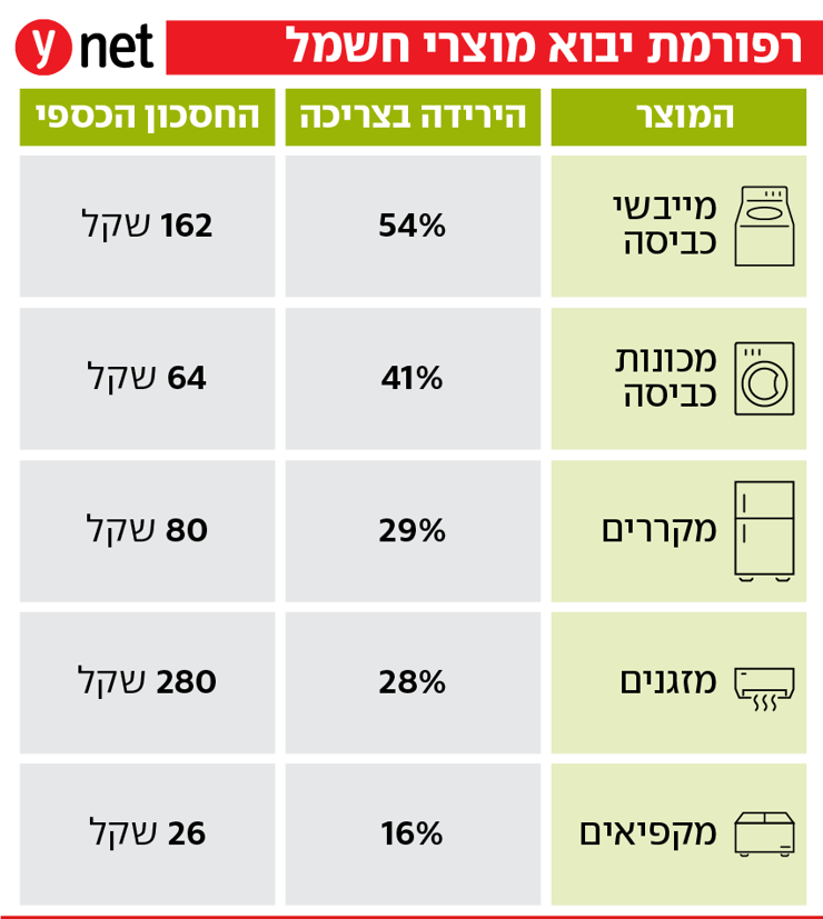 מאז רפורמת יבוא מוצרי חשמל לבנים, עם תקינה אירופית שמחייבת צריכת אנרגיה נמוכה יחסית למה שנמכר בארץ עד כה - מכונות הכביסה, מקררים, מייבשי כביסה ומקפיאים שנמכרים בישראל צורכים פחות חשמל ולמרות עליית המחירים במשק הם נמכרים בזול לעומת מחירי 2021, טרם רפורמת הייבוא.