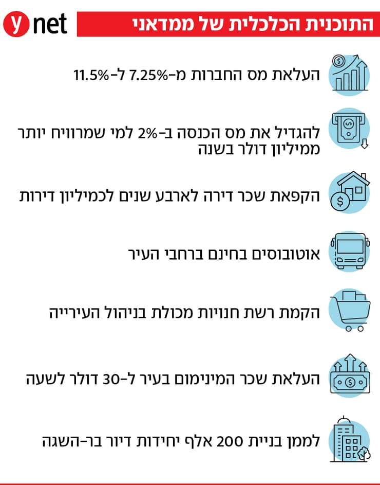 ממדאני, חבר אסיפת מדינת ניו יורק בשלוש הקדנציות האחרונות, מקדם תוכנית כלכלית שמטרתה להתמודד עם יוקר המחיה בעיר, אך מעוררת התנגדות חריפה בקרב הקהילה העסקית. בין היתר מציע ממדאני להעלות את מס החברות מ-7.25% ל-11.5%; להוסיף 2% מס הכנסה על מי שמרוויח יותר ממיליון דולר בשנה; להקפיא את שכר הדירה למשך ארבע שנים לכמיליון דירות בפיקוח; להשיק שירות אוטובוסים חינם ברחבי העיר; להקים רשת חנויות מכולת בניהול העירייה שיהיו פטורות מתשלום שכירות ומיסי נדל"ן; להעלות את שכר המינימום בעיר ל-30 דולר לשעה עד 2030; ולממן ולבנות 200 אלף יחידות דיור בר-השגה.