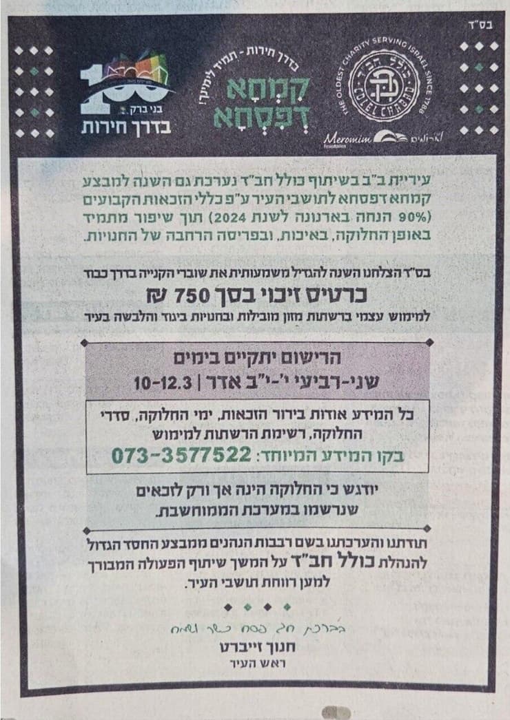 עיריית בני ברק פרסמה בעיתונות החרדית מודעות לפיהן יחולקו השנה כרטיסי "קמחא דפסחא" - תווי קניה למשפחות מעוטות יכולת לקראת החג בשווי 750 שקל למשפחה, בעלות כוללת של מיליוני שקלים, אך קבעה תנאים מפלים לטובת משפחות מרובות ילדים, על אף שבג"ץ פסל זאת לאחרונה.