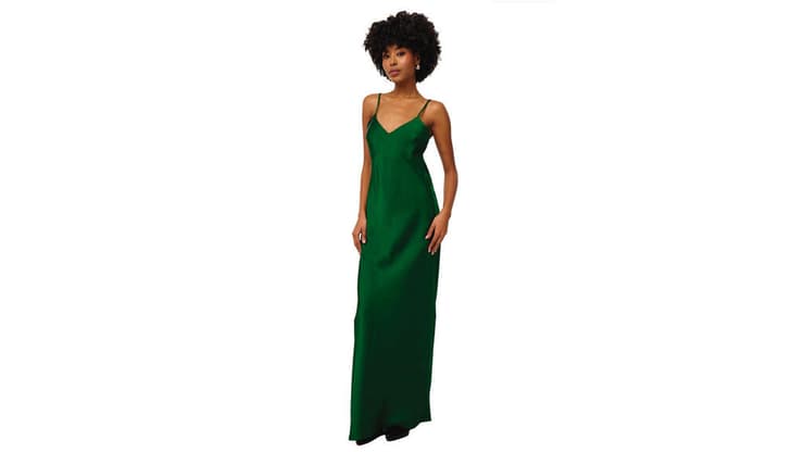 רשת Twentyfourseven מציגה שמלת סאטן מקסי בצבע ירוק בקבוק. מחשוף V וכתפיות דקות מתכווננות.