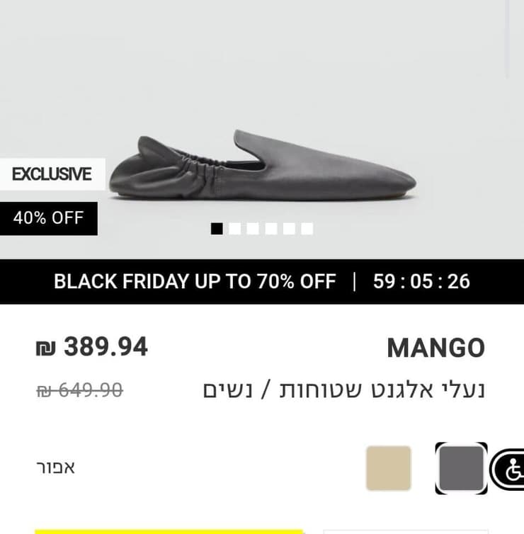 גם בנעליים מנגו ישראל יקרה יותר. נעלי אלגנט שטוחות מעור מתומחרות בארץ ב-649.90 שקל וביוון ב-75.99 יורו שהם 288 שקל, כלומר בארץ הן מתומחרות ב-361.9 שקל יותר! אפשר לקנות ביוון שני זוגות במחיר של ישראל, כי בארץ הן עולות 126% יותר.