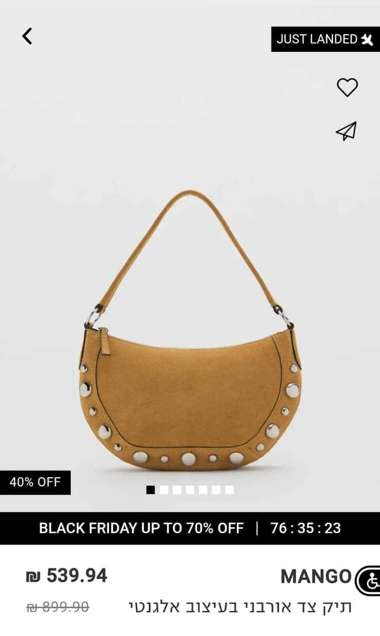 עוד דוגמא: תיק צד אורבני זמש עם קישוטי מתכת, מתומחר בארץ בלא פחות מ-899.90 שקל לעומת 341 שקל בלבד ביוון: פער של 558.8 שקל! כלומר התמחור שלו בישראל גבוה ב-164%: יותר מפי 2.5.