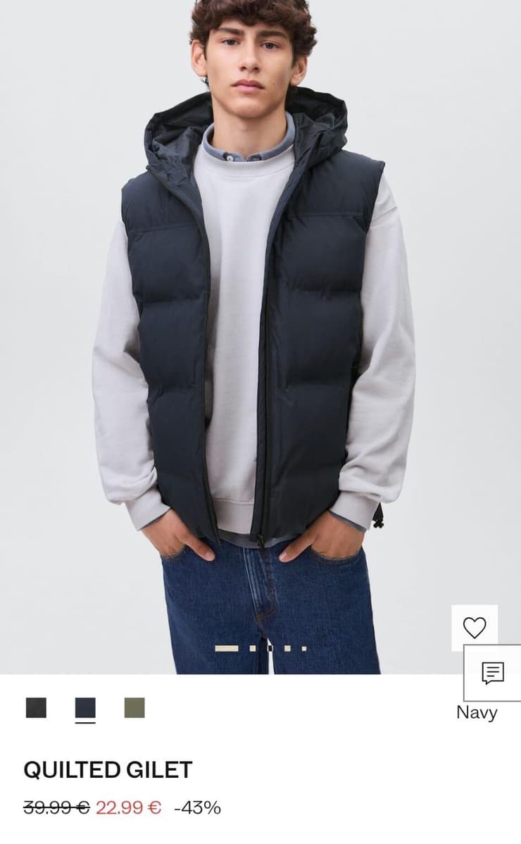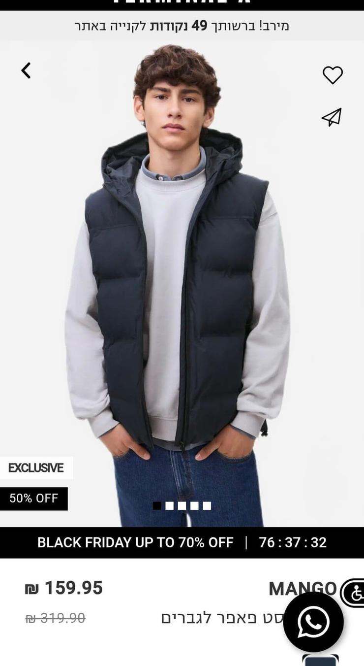 וסט פאפר לגברים מתומחר בארץ ב-319.90 שקל, כשבמנגו יוון (ובמדינות אחרות) מחירו 39.99 יורו, 151.6 שקל בלבד. כלומר, ביוון תשלמו 168.3 שקל פחות על אותו וסט, פער של 111%.