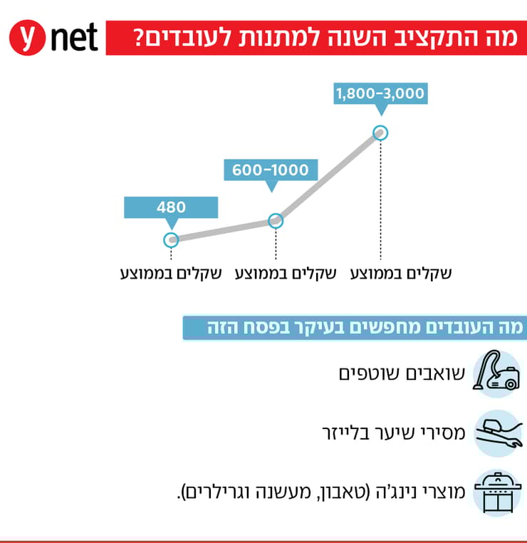 נועם בוסידן, הייטקזון, מספר: "אנחנו נותנים שירות למעל 400 ארגונים פעמיים בשנה בחג, אנבידיה, רפאל, מייקרוסופט חלקם הייטק, חלקם ארגונים ממשלתיים. הסתכלנו על תקציבים השנה, כי עניין אותנו האם הארגונים רגישים לזה שיוקר המחיה עלה ויש שחיקה של שווי המתנות. ראינו שיש 6.5% גידול בתקציב הארגונים מול השנה שעברה. זאת אומרת, אם ממוצע של עלות מתנה היה די יציב בשנתיים שלוש האחרונות, באזור 450 שקל בממוצע למתנה לעובד בפסח, כי יש שנותנים 1,000 שקל ויש שנותנים 300 שקל, זה עלה לאזור 480 שקל".