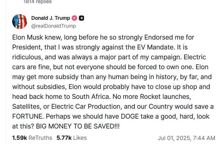 טראמפ כמובן אינו נשאר חייב, ובפוסט ברשת החברתית שלו Truth Social ביטל את דבריו של תומכו הגדול וידידו לשעבר, וטען כי הם מגוחכים. הנשיא התייחס בעיקר למרכיב בחוק שככל הנראה הוא הסיבה האמיתית לזעמו של מאסק - הצמצום הדרסטי בהטבות לחברות אנרגיה מתחדשת, שעימן נמנית טסלה. "בלי הסבסוד העצום שהוא נהנה ממנו כל השנים, אילון ככל הנראה היה סוגר את החנות וחוזר הביתה לדרום אפריקה", לועג הנשיא.