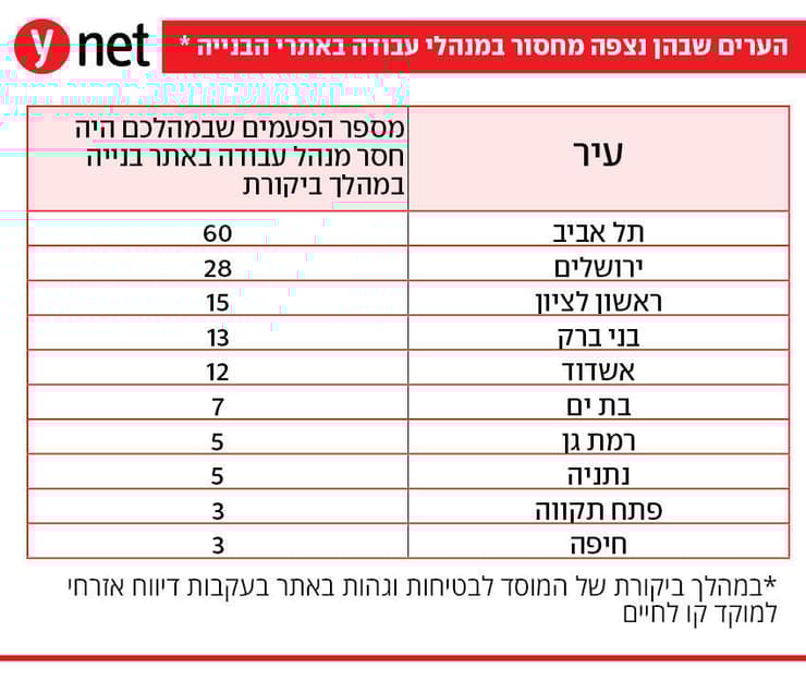 הדוח מצביע גם על פערים מדאיגים בנוכחות מנהלי עבודה באתרי בנייה: העיר תל אביב-יפו מובילה בהיקף המקרים שבהם נמצא חוסר בנוכחות מנהל עבודה במהלך ביקורת של המוס"ל, עם שיעור של כ-39.7% מהמקרים שבהם אותר ליקוי. ירושלים אחריה עם 18.5%, ראשון לציון עם 9.9% ,בני ברק עם 8.6% ואשדוד עם 7.9%.