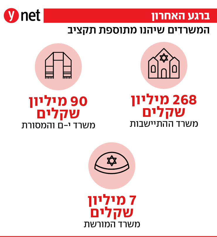 הנה מה שנמצא חשוב יותר מאלה: תלמידי ישיבות מחו"ל (60 מיליון), מניעת נשירה מהישיבות (28 מיליון), שיפוצים בחינוך העצמאי (25 מיליון), טהרת המשפחה (3 מיליון), סליחות ול"ג בעומר (21 מיליון), וכמובן העברת 485 מיליון שקל למשרד ההתיישבות של "אלופת" מגייסי הכספים, השרה אורית סטרוק (הציונות הדתית), וגם 78 מיליון שקל למשרד המורשת ו-118 מיליון שקל למשרד ירושלים ומסורת.