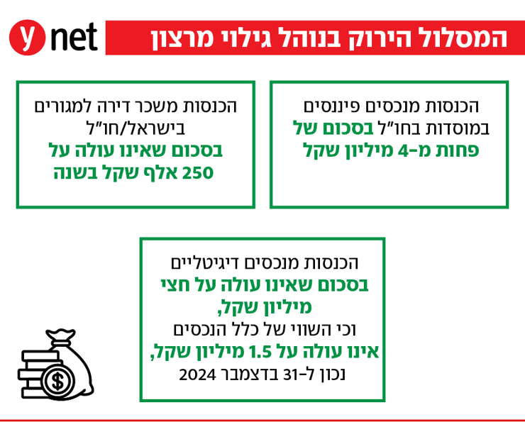 במסגרת המסלול הירוק יטופלו בקשות המתייחסות להכנסות שמקורן בנכסים פיננסיים המוחזקים במוסד פיננסי מחוץ לישראל שהיתרה שלהם ל-31 בדצמבר 2024 נמוכה מ-4 מיליון שקל (כמיליון אירו), וכן לא היו הפקדות או העברות כספים חדשים לחשבון הפיננסי בתקופת הגילוי; או הכנסות משכ"ד למגורים בישראל או בחו"ל בסכום שאינו עולה על 250 אלף שקל לשנה; או הכנסות שמקורן בנכסים דיגיטליים בסכום שאינו עולה על 500 אלף שקל לכל תקופת הגילוי. אשר לנכסים דיגיטליים, שוויים ההוגן נכון ל-31 בדצמבר 2024 לא יעלה במסלול הירוק על 1.5 מיליון שקל. ההחלטה על המסלול שבו תטופל הבקשה תתקבל על ידי רשות המיסים, לאחר אישור הבקשה.