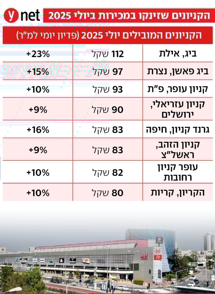 בפילוח הנתונים עולה כי הפאוור-סנטרים רשמו את הזינוק המרשים ביותר – עלייה של 13.5% בפדיון, עם ממוצע יומי למ"ר של 47 שקל, לעומת 42 שקל ביולי אשתקד. הקניונים האזוריים עלו ב־6% והגיעו לממוצע של 77 שקל למ"ר ליום, לעומת 73 שקל בשנה שעברה. בענף מציינים כי העלייה במכירות בולטת במיוחד לנוכח העובדה שיולי שעבר נחשב לשנה יוצאת דופן בעוצמתה.