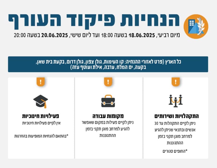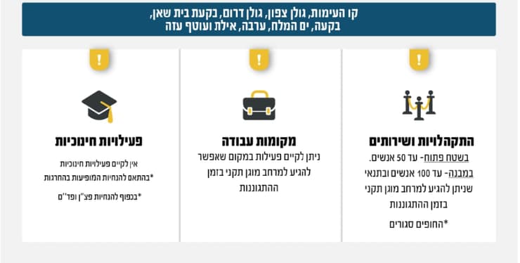 ניתן לקיים פעילות במקומות עבודה שאפשר להגיע מהם למרחב מוגן תקני בזמן ההתגוננות. בתי הספר והגנים יישארו בשלב זה סגורים.