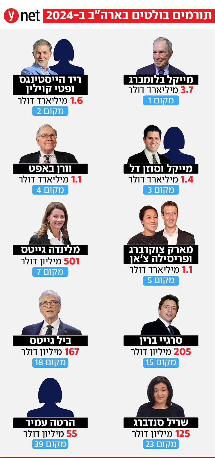המיליארדר מייקל בלומברג, לשעבר ראש עיריית ניו יורק, שתרם מעל ל-100 מיליון שקל לשיקום צפון הארץ, מוביל את רשימת התורמים הגדולים בארה"ב זו השנה השנייה ברציפות. בלומברג ממשיך לבסס את מעמדו כאחד הפילנתרופים המשפיעים בעולם גם ב-2024 וניצב בראש רשימת "50 הפילנתרופים הגדולים באמריקה", שפורסמה על ידי Chronicle of Philanthropy, עם תרומות בסך 3.7 מיליארד דולר.