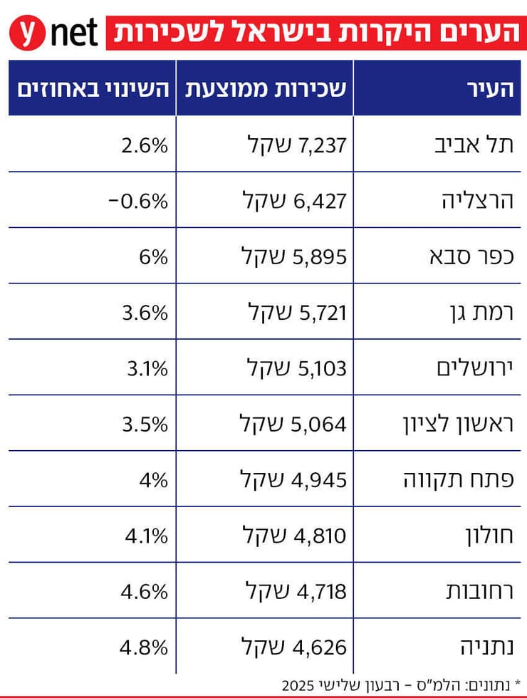 באיזו עיר הכי זול לשכור דירה ואיפה המחירים זינקו? כמדי רבעון, ynet צולל לנתוני הלשכה המרכזית לסטטיסטיקה (הלמ"ס) ובוחן את מחירי שכר הדירה ב-18 הערים הגדולות בישראל. בסוף השבוע האחרון פרסמה הלמ"ס את מדד השכירות במסגרת מדד המחירים לצרכן לחודש אוקטובר, ויחד איתו גם את מחירי השכירות הממוצעים לרבעון השלישי של שנת 2025. על פי הנתונים, בחודשים יולי-ספטמבר, שכר הדירה הממוצע עמד על סכום חודשי של 4,952 שקל – עלייה של כ-1.5% לעומת הרבעון הקודם ושל כ-4.3% לעומת הרבעון המקביל.