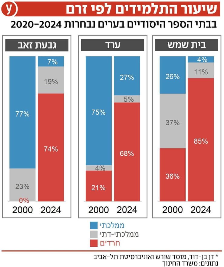 בשנת 2000, ערד הייתה עיר חילונית יחסית. שלושה רבעים מתלמידי בתי הספר היסודיים בה למדו בזרם הממלכתי ורק 21% בזרם החרדי. תוך 24 שנים בלבד, התמהיל הדמוגרפי התהפך, כאשר חלקו של הזרם החרדי עלה ל-68% וחלקו של הזרם הממלכתי ירד ל-27%. בגבעת זאב לא היו כלל בתי ספר חרדים בתחילת המילניום. תוך פחות משני עשורים וחצי, חלקם של תלמידי בתי הספר היסודיים הממלכתיים ירד מ-77% ל-7% בעוד חלקם של החרדים הגיע ל-74%.