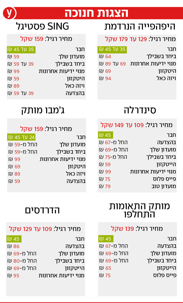 טווחי מחירי הכרטיסים במחירם הרגיל נע כמדי שנה בין 89 שקל לכרטיס ויכול להגיע גם עד ל-179 שקל. אנחנו נמצאים חודש וקצת לפני הדלקת נר ראשון בחנוכייה, ולכן מומלץ כבר כעת, לפני הרכישה, לעשות בדיקה בקרב ההטבות המוצעות לכם בכרטיסי האשראי שברשותכם. זאת לצד הטבות שוות שמעניקה חברות במועדונים השונים. ההנחות יכולות להגיע עד 80% לכרטיס. הנחות בהחלט משמעותיות ששוות לא מעט כסף.