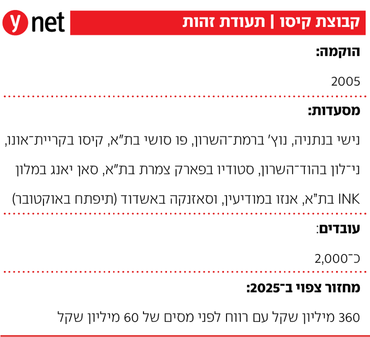 קבוצת קיסו הוקמה ב-2005 ומפעילה כיום תשע מסעדות ברחבי הארץ: נישי בנתניה, נוץ' ברמת-השרון, פו סושי בתל-אביב, קיסו בקריית-אונו, ני-לון בהוד-השרון, סטודיו בפארק צמרת בת"א, סאן יאנג במלון INK בת"א (שבה היא שותפה), אנזו במודיעין, וסאזנקה באשדוד (שתיפתח באוקטובר). העסקה בוצעה לפי שווי מוערך של 320 מיליון עד 350 מיליון שקל.