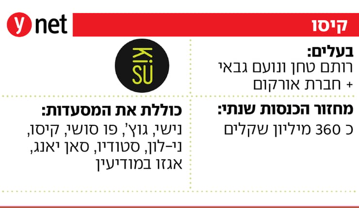 החודש נחשף ב"ממון" כי קבוצת אנשי עסקים, הכוללת את מייסדי גוד פארם אדם פרידלר ואוהד סנדלר, יו"ר ביג איתן בר זאב, מנכ"ל ביג חי גאליס ואורי מקס בעלי רשת מקס סטוק, נכנסה לשותפות בקבוצת קיסו, שמייסדיה הם רותם טחן ונועם גבאי ומחזורה השנתי יגיע השנה לכ-360 מיליון שקל. קיסו מתמחה באוכל אסייתי ומפעילה תשע מסעדות: נישי בנתניה, נוצ' ברמת השרון, פו סושי בתל אביב, קיסו בקריית אונו, נאי-לון בהוד השרון, סטודיו בפארק צמרת בתל אביב, סאן יאנג במלון INK בתל אביב (שבו היא שותפה), אנזו במודיעין וסאזנקה באשדוד (שתיפתח באוקטובר).