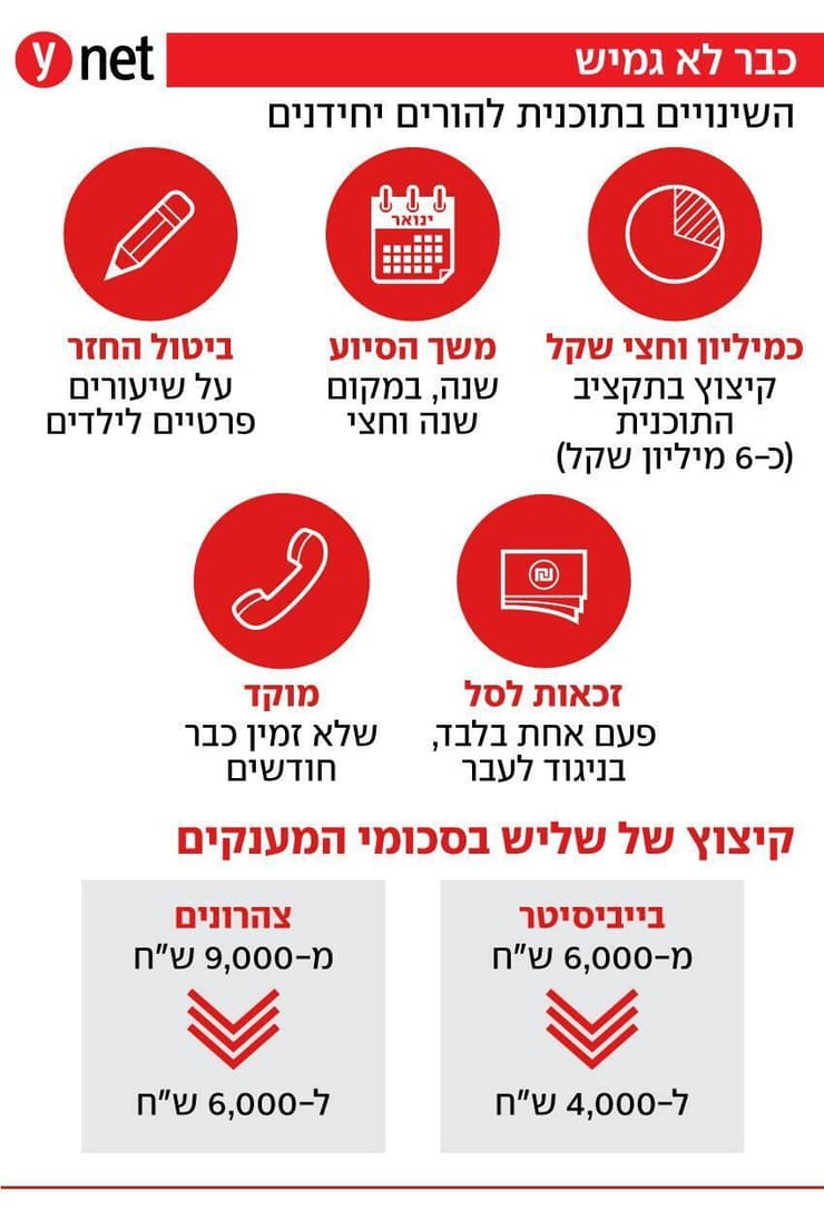 גם היקף הסיוע למי שנמצאה זכאית, הצטמצם: במקום 18 חודשים, 12 חודשי סיוע בלבד. הנוהל החדש אינו מאפשר לקבל החזר עבור שיעורים פרטיים לילדים, כפי שהיה בעבר, אלא רק עבור שמטרפות, קייטנות וצהרונים. סכומי המענקים הצטמצמו באופן משמעותי גם הם: מ-6,000 שקל בשנה עבור הוצאות בייביסיטר ל-4,000 שקל בלבד, מ-9,000 שקל עבור צהרונים ל-6,000 שקל בלבד.