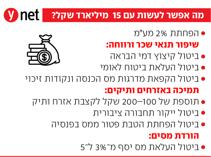 להפחית את המע"מ באחוז אחד שעלה ב-1 בינואר השנה – בעלות של 7.5 מיליארד שקל, כאשר הקצאת כל הסכום של 15 מיליארד שקל לתחום המע"מ הייתה מאפשרת את הפחתת השיעור מ-18% ל-16%.