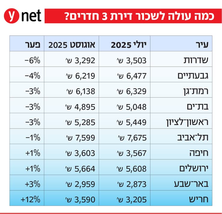 ניתוח נתוני שכר הדירה בערים בולטות באוגוסט 2025, שערכה עבור ynet ו"ממון" חברת דיפרנט המעניקה הגנה לשכר דירה עבור בעלי דירות, מציג ירידה של כ-4% לעומת החודש שקדם לו – מסכום ארצי ממוצע של 5,433 שקל בחודש יולי לסכום של 5,195 שקל בחודש שעבר. ביחס לאוגוסט שנה שעברה עדיין מדובר בעלייה שנתית של כ-4%.