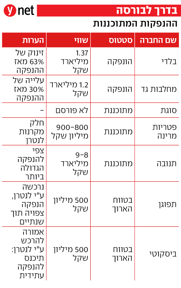 שטף הנפקות של חברות מזון מגיע לבורסה בתל-אביב: לאחר הנפקת "בלדי", יבואנית ומעבדת הבשר, ומחלבות גד הוותיקה, מתכוננת להנפקה גם חברת סוגת – יצרנית ויבואנית של סוכר, מלח, אורז, קטניות, טחינה "אל ארז", קמח, שמן "עץ הזית" ועוד. גם פטריות מרינה, מגדלת הפטריות מהצפון מתוכננת להנפקה בשווי 800 עד 900 מיליון שקל. וההנפקה הגדולה מכולן: בעליה של תנובה, קבוצת המזון הגדולה בישראל, מתכננים להנפיקה לפי שווי בסך 9-8 מיליארד שקל.
