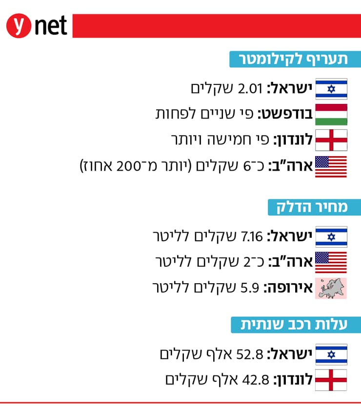 הפער המרכזי מתגלה בצד ההוצאות. מחיר הדלק בישראל בשנת 2025 עמד על כ-7.16 שקלים לליטר, הגבוה ביותר מבין ערי ההשוואה. באירופה המחיר נמוך בכ-17% בממוצע, ובארצות-הברית הוא זול ביותר מפי שניים. נהג מונית בישראל נוסע בממוצע יותר מ-62 אלף קילומטרים בשנה, ולכן עלות הדלק השנתית מוערכת בכ-40 אלף שקלים. לכך מתווספות עלויות ביטוח חובה וצד ג’ של כ-11 אלף עד 18 אלף שקלים בשנה, לצד תחזוקה ואגרות. בסך הכל, עלויות הרכב השנתיות בישראל מוערכות בכ-52.8 אלף שקלים, גבוהות בכ-10 אלף שקלים מהעלות בלונדון ונמוכות משמעותית בדבלין ובניו-יורק. לכך מצטרפת עלות כניסה לשוק של יותר מ-280 אלף שקלים עבור רישיון מונית, בשוק שבו התעריפים נמוכים ומפוקחים. התוצאה היא שוק שבו הצרכן משלם מעט, אך הנהג נושא בנטל כלכלי כבד, פער שמעמיד את ענף המוניות בישראל בפני אתגר מתמשך.