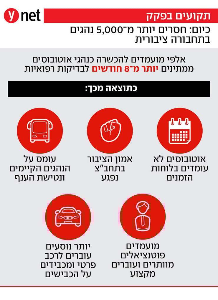 על רקע המחסור החמור בכ-5,000 נהגים בתחבורה הציבורית, הכשרות של אלפי נהגים פוטנציאליים מעוכבות ומבוטלות בשל קיפאון במתן אישורים רפואיים, שנמשך כבר חודשים ארוכים.