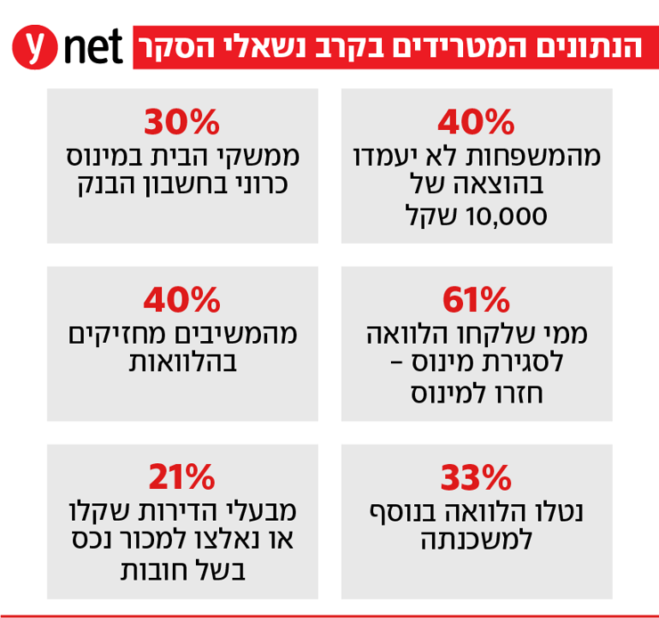 כשליש ממשקי הבית בישראל אינם סוגרים את החודש, כ-40% לא יעמדו בהוצאה חריגה, 30% ממשקי הבית נמצאים במינוס כרוני וחמישית מבעלי הדירות בישראל הגיעו למצב של סף אובדן הנכס שלהם. כך עולה מממצאי סקר חדש שערך ארגון "דף חדש", הפועל לצמצום בעיית החובות של משקי הבית בישראל ולמניעת קריסה כלכלית של משפחות ועסקים קטנים.