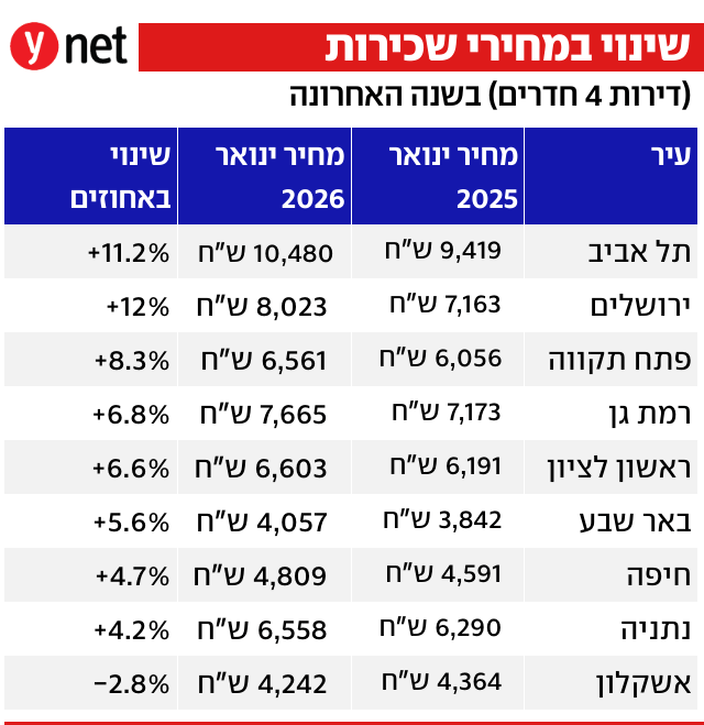 2026 נפתחה עם עלייה נוספת במחירי השכירות וירידה בהיצע הדירות להשכרה, זאת אחרי עליות עקביות בגובה שכר הדירה לאורך 2025. כך עולה מנתונים עדכניים שהגיעו ל-ynet ול"ממון".
