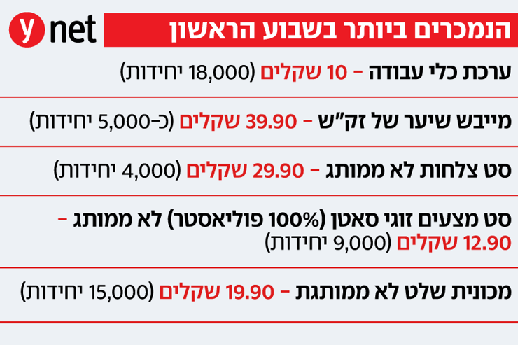 ויש לדבריו עוד הפתעות: "נשים קונות את המוצרים המקצועיים ביותר בתחום כלי העבודה אצלנו, כמו גם המכירות המטורפות של כלי העבודה. הערכה הנמכרת ביותר היא זו ב-10 שקלים, שממנה נמכרו 18 אלף יחידות".