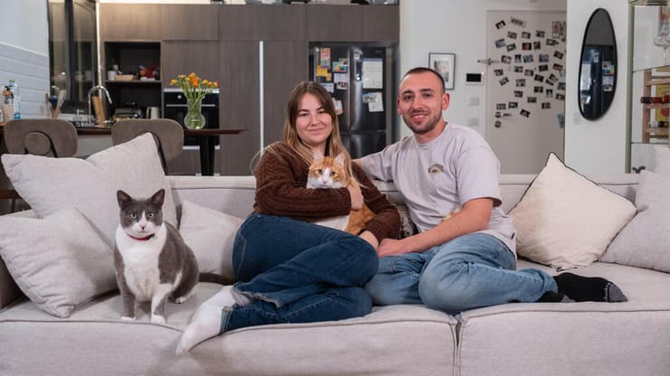 בצילום: דב (29), מאיה (26) והחתולים הארי ומייגן.