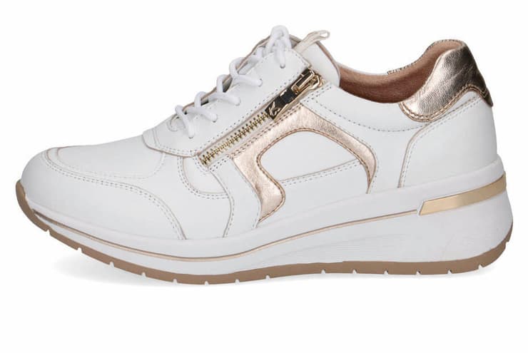 הלב הכחול, נעלי נוחות, מציעים סניקרס על סוליית פלטפורמה בגובה 5 ס"מ, בצבע לבן ונגיעות זהב. עיצוב ספורט אלגנט, עם רוכסן לנעילה מהירה ושרוכים. רפידת פטנט OnAir. ליום ולערב.