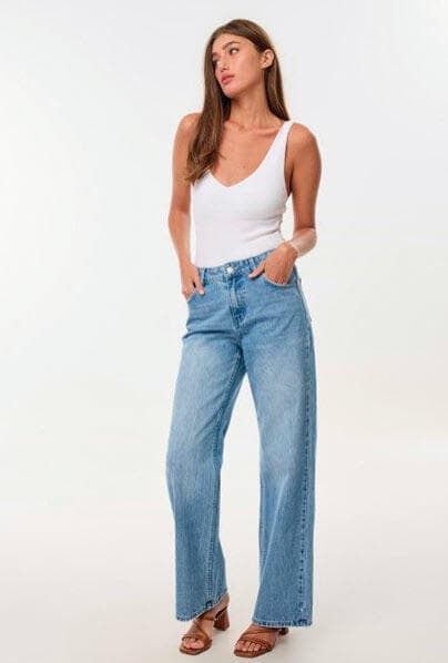 טוונטיפורסבן מציעים ג'ינס אלה עם רגל רחבה, חמישה כיסים וסגירת כפתור ורוכסן.