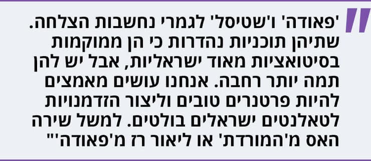 "כן, לגמרי. 'פאודה' היא מאוד מקורית ומדוברת. ו'שטיסל' זכתה לפופולריות מאוד רחבה. שתיהן תוכניות נהדרות כי הן ממוקמות בסיטואציות מאוד ישראליות, אבל יש להן תמה יותר רחבה. אז שתיהן הצלחה מאוד גדולה ונמשיך לעשות עוד סדרות כאלה. נטפליקס באופן בסיסי מאמינה בשיתוף תוכן מרחבי העולם".