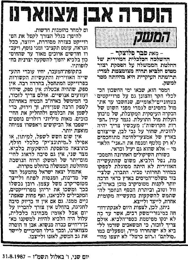 "הכלכלה הישראלית היא באמת פלא. בלי אוצרות טבע, את הגז הטבעי מצאנו רק לפני כמה שנים, עם הוצאות ביטחון גבוהות מאוד,שישה-שבעה אחוזים מהתוצר המקומי כשיש שלום - ועדיין היא צומחת, היא מתפתחת, היא התגברה על אין-ספור משברים, יש לנו היום עתודות מטבע חוץ מהגבוהות ביותר בעולם המערבי יחסית לתוצר שלנו, יש לנו ייצוא ענק, יש לנו הייטק מאוד-מאוד מפותח, יש צמיחה יפה, אין אבטלה.