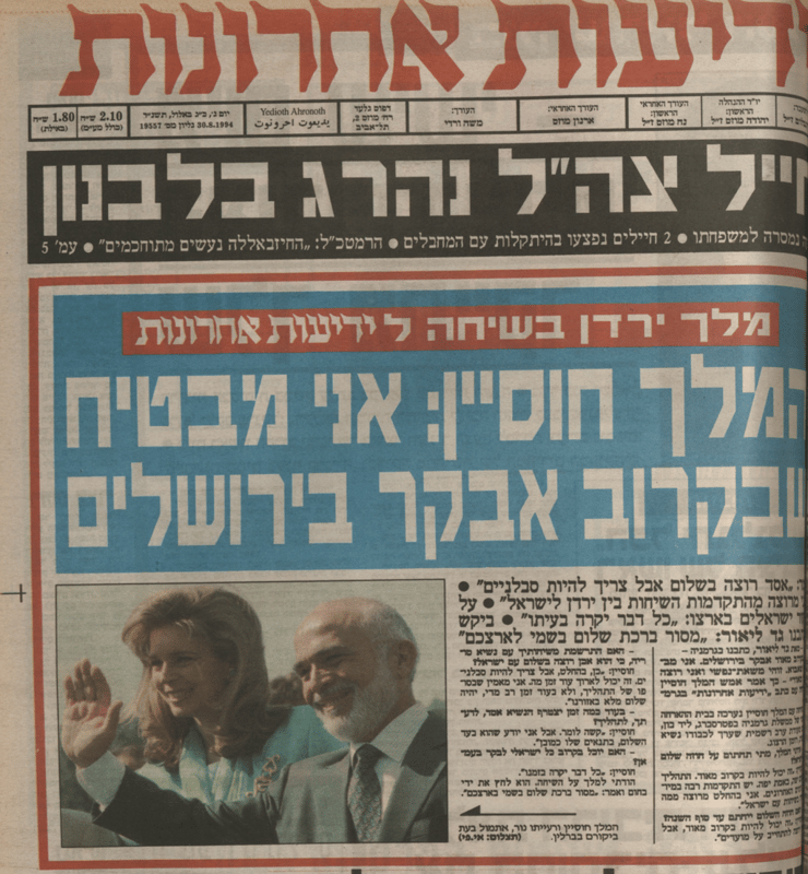 עוד ידיעה אחת מהארכיון, באמת סיפור חשוב שהיה גם בשער העיתון, המלך הירדני חוסיין מבטיח "בקרוב אבקר בירושלים". הידיעה מ-30 באוגוסט 1994.