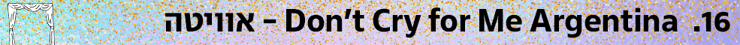 השיר הכי זכור וכנראה גם הכי עוצמתי, שגם עליו חתום וובר, הוא Don’t Cry for Me Argentina, ולא בכדי הוא מבוצע פעמיים: פעם אחת בנאומה של אוויטה לאחר שבן זוגה, חואן פרון, נבחר לנשיא, ובפעם השנייה רגע לפני מותה. כשהיא מבקשת "אל תבכו עליי", מדונה, בנעליה של אוויטה, מספקת ביצוע כמעט מושלם שלימים יהפוך למוכר יותר מהמחזמר. בשירתה היא משלבת עוצמה רגשית עם שליטה ווקאלית מרשימה, ומשדרת בו-זמנית פגיעות וכריזמה - זיקוק של הסיבות לכך שאוויטה היא דמות היסטורית כל כך מרתקת. איה חיות