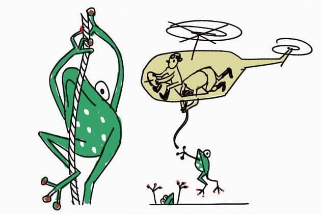חשבו על מסוק של יחידת חילוץ שנשלחת לחלץ את הצפרדעים הטובעות. דמיינו שמעליהן נזרק חבל הצלה. קפיצה אחת גדולה, מאמץ עילאי, והן יכולות לאחוז בו ולטפס אל בטן המסוק. למי יש סיכוי טוב יותר להינצל עכשיו – לזו שכילתה את כל כוחותיה במאבק עיוור, או לי? נכון מאוד.