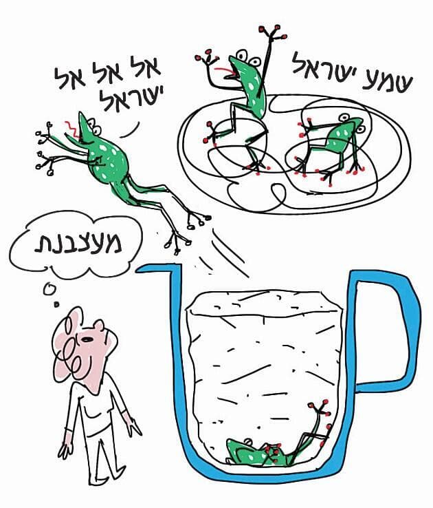 גם למשל הזה אני רוצה לשים סייגים. אני חושבת שצפרדע מיואשת, רואת שחורות, דווקא כן תחוש בשינויי הטמפרטורה ההדרגתיים, ואעיד על עצמי: אל הרכב הממשלה הנוכחי הגעתי כבר מבועתת. שנים אני צופה בחרדה בתהליכי העומק האיטיים של הלאומיות, המשיחיות, המגזריות והגזענות בחברה הישראלית. לא הייתי צריכה להגיע עד לנקודת הרתיחה של 7 באוקטובר כדי לצאת להפגנות, לאכול פחמימות ולתלוש שערות.