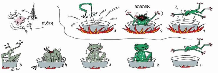 אני עוברת למשל אחר, מפורסם לא פחות. שוב צפרדעים, רק שהפעם המשל מעוניין ללמד אותנו משהו על טיבה של ערנות, וליתר דיוק, ערנות לשינויים הדרגתיים. נגיד, סתם דוגמה, ערנות לאובדן הדרגתי של חירויות אזרחיות וגלישה לעבר שלטון מלוכני. במשל הזה, צפרדע נזרקת פעמיים לסיר. למרות שמבחינה מדעית הניסוי הזה מעולם לא בוצע, המשל טוען שאם תיזרק הצפרדע למים רותחים, היא תקפוץ בבהלה החוצה; ואם תיזרק למים פושרים, היא תתאים את עצמה לחום העולה, עד שבסופו של דבר תתבשל למוות והצרפתים יוכלו למצוץ את רגליה היפות במסעדת מישלן.