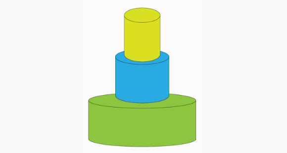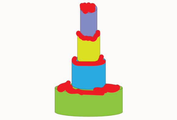 אז כתרגיל חימום בזמן שתנור האפייה מתחמם, נבדוק מה יקרה אם נרצה לצפות את העוגה רק מלמעלה. כלומר רק את טבעת הגג של כל שכבת עוגה. הנה, החלקים האלה: