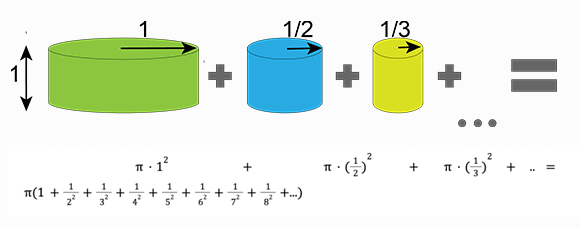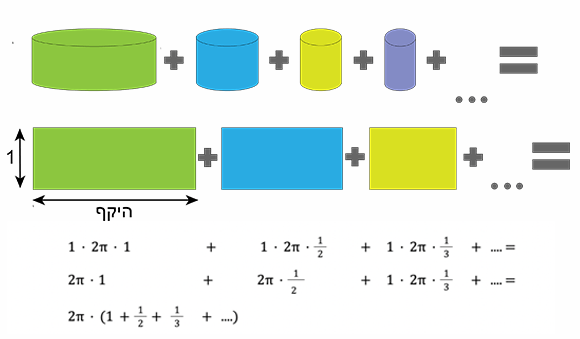 כלומר גודל הציפוי הנחוץ לכיסוי דפנות העוגה שלנו, שהוא סכום המעטפות של הגלילים, שהוא סכום של מלבנים – הוא אינסופי. . וזה הגיוני: כשמסתכלים על העוגה מלמעלה רואים עיגול, ולכן הציפוי מלמעלה יוצא סופי. אבל כשמסתכלים על העוגה מהצד היא אכן נראית אינסופית, והגיוני שזה מה שיראה החישוב. אז אי אפשר לצפות את העוגה. כלומר, אפשר רק מלמעלה, אבל זה לא באמת נחשב ציפוי אם הוא לא מכסה יפה גם את דפנות העוגה, נכון?