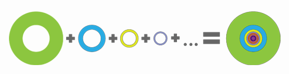למרבה המזל מספיק שינוי קל של נקודת המבט והשאלה הזאת נהיית הרבה יותר פשוטה. והפעם זה יהיה באמת שינוי של נקודת המבט, במובן הכי מילולי שאפשר: במקום להסתכל על העוגה מהצד נביט בה מלמעלה. ומלמעלה, העוגה האינסופית שלנו היא פשוט עיגול. עיגול אחד. כל הטבעות נכנסות בול זו בתוך זו, ויוצרות ביחד פשוט עיגול אחד שרדיוסו 1 מטר, כמו השכבה הראשונה.