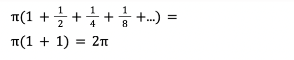 עכשיו צריך להיזכר מה הסכום הזה מייצג ולמה רצינו לחשב אותו מלכתחילה. הסכום הזה הוא תוצאה של ההכבדה. כלומר הוא גדול יותר מסכום אחר – זה שמייצג את הנפח של העוגה. עשינו את זה כדי לדעת אם אפשר לאכול אותה. אם הנפח שלה קטן מ-2π, אנחנו אומנם לא יודעים מה הוא בדיוק, אבל ברור לנו שהוא לא אינסופי. באופן מאוד לא אינטואיטיבי, הנפח של העוגה הזאת, שיש לה אינסוף קומות, הוא סופי.