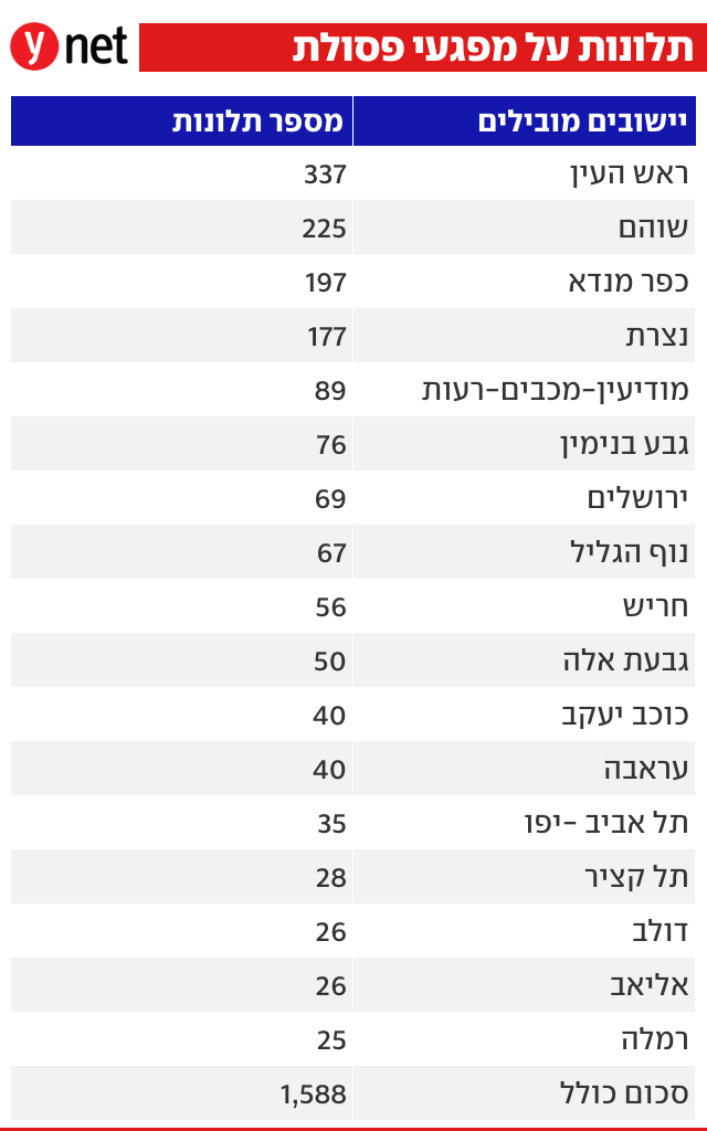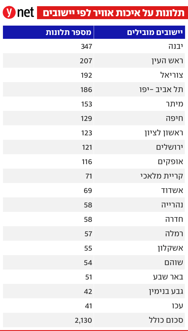 בתלונות על איכות האוויר מובילות יבנה וראש העין ולאחר מכן מושב צוריאל שליד מעלות. את המקום השלישי תופסת תל אביב ובהמשך מיתר, חיפה, ראשון לציון, ירושלים ואופקים.