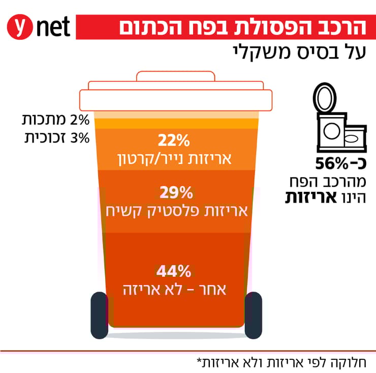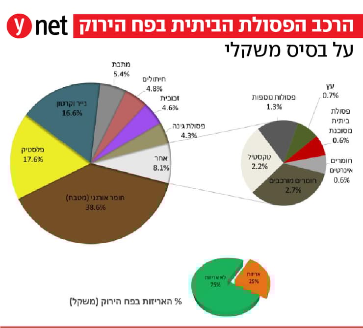 איך נראית הפסולת של הישראלים? סקר ראשון מסוגו שערך המשרד להגנת הסביבה בדק את הרכב הפסולת הביתית בפחים הירוקים במטרה להבין את דפוסי הצריכה של הישראלים ולהתאים אליהם את מדיניות ניהול הפסולת. הסקר, שמתפרסם הבוקר (יום ד'), נערך בשנים 2024-2023. הוא התבסס על דגימות מייצגות של כ-31 טונות פסולת, ונבנה כך שייצג את כלל האוכלוסייה.