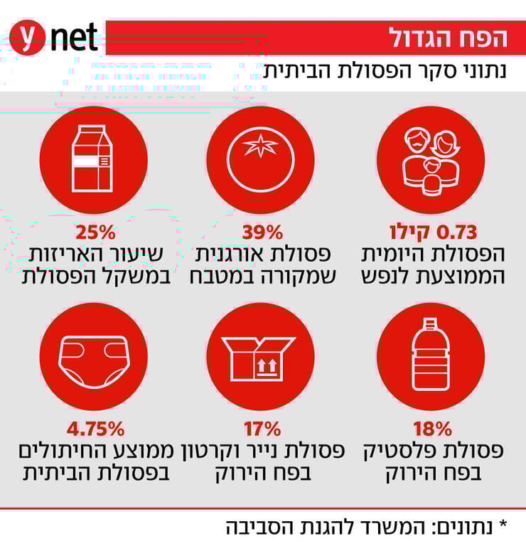 המרכיב הבולט ביותר בפח האשפה הישראלי הוא חומר אורגני שמקורו במטבח, ושיעורו כ-39% מכלל משקל הפסולת. ממוצע החיתולים בפסולת, אגב, עמד על 4.75% מכלל הפסולת. שיעור הפסולת האורגנית שמקורה במטבח בפח האשפה ירד בהשוואה לסקר הפסולת הארצי הקודם, שנערך בשנים 2013-2012 ואז הוא עמד על 44%.