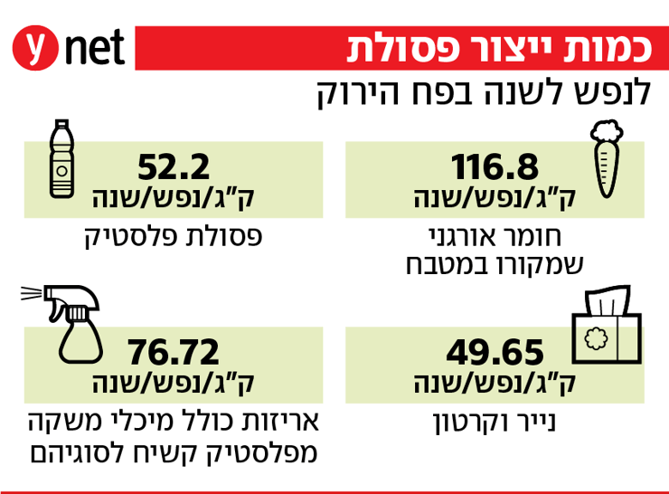 מהנתונים עולה כי כמות הפסולת המושלכת לפח הירוק עומדת על 730 גרם ליום לנפש בממוצע. יש לציין כי לפי הלשכה המרכזית לסטטיסטיקה (הלמ"ס) כמות ייצור פסולת לאדם בישראל היא 1.79 ק"ג ליום, אך הנתון הזה משכלל פסולת עירונית מעורבת שכוללת פסולת גזם, פסולת ביתית, מסחרית ועוד.