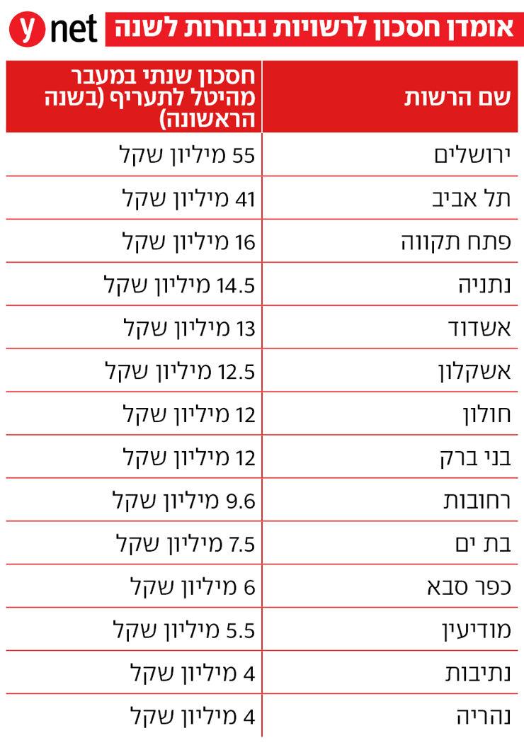 לפי נתוני האוצר, הרפורמה צפויה לחסוך לרשויות המקומיות כ-580 מיליון שקלים בשנה הראשונה, סכום דומה לשנה השנייה ביחס לשיטה הקיימת. דוגמה לחיסכון: ירושלים תחסוך 55 מיליון שקלים בשנה, תל אביב 41 מיליון, פתח תקווה 16 מיליון, בני ברק 12 מיליון ומודיעין 5.5 מיליון.