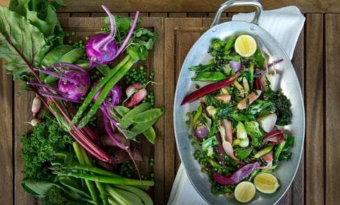 - מטגנים את המצרכים קלות ומוסיפים יין לבן, שום, פטרוזיליה, אפונה, תרד, סלק וקולורבי.